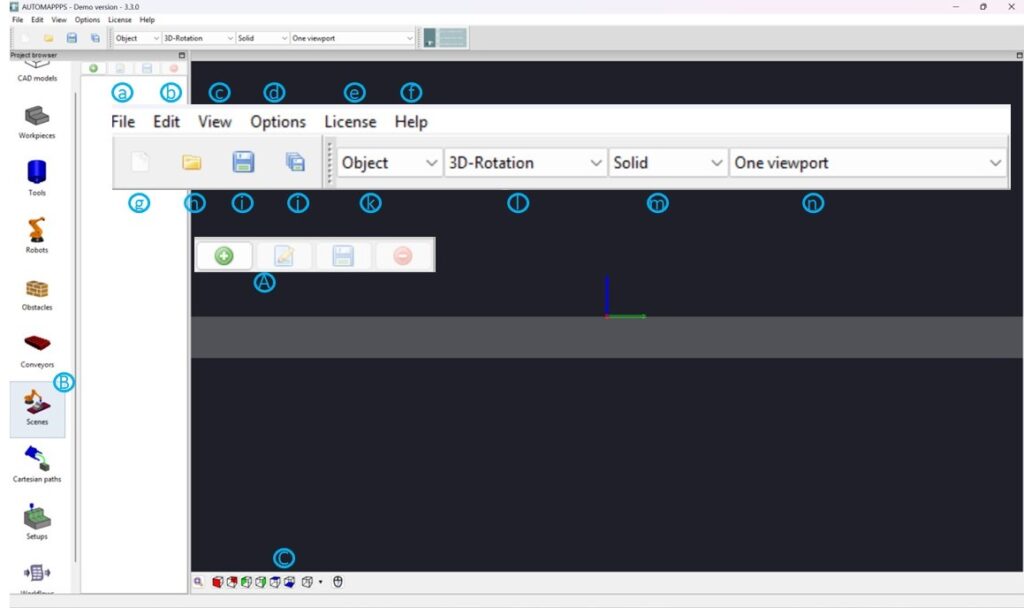 - B: Project browser – guides you through the steps of programming: From top down: “CAD editor“, to load/import, edit, manipulate CAD Data, “Work-piece Editor” to enrich a loaded CAD to become a workpiece to be treated, “Tool-Editor” to model tools with processes (simulation.model), flanges TCPs, and models for visualization and collision avoidance with different stages (e.g. open and closed grippers), “Robot -Editor” to import new robots and potentially limit the joints for all robots, “Obstacle-editor” to enrich a loaded CAD to become an obstacle, “Conveyor-Editor” to enrich a loaded CAD to become an 7th-axis (or 8th, 9th), rotation-table, conveyor etc., “Scene Editor” to assemble objects, obstacles, robots to robot-cells,”Cartesian-Path” for defining spacial approaching motions (very rately used by experts only), “Setup-Editor” to define and simulate tool-paths and processes, “Workflow-Editor” to assign tool-paths to robots and plan collision-free, singularity free etc… After a cell is designed, the real programming happens in “Setup-Editor” and “Workflow-Editor”