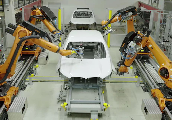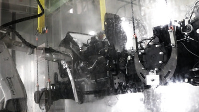 Image: Robots cleaning small lotsize, high-variant traktors. Offline programmed using AUTOMAPPPS robot offline programming and simulation.