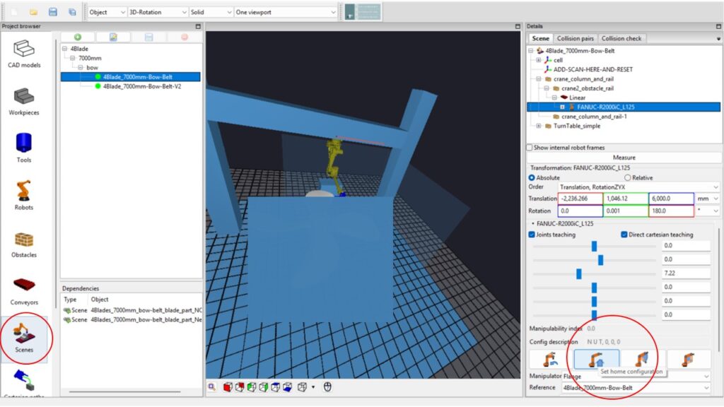 Image: defining the HOME-pose of the robot in the “scene editor”: Change the joint values and then press “set home configuration”.