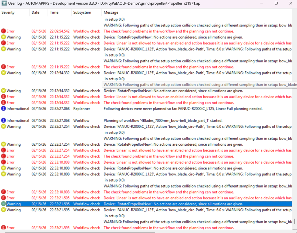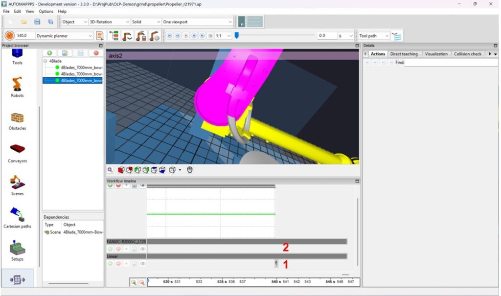 The devide Linear is planned actively and has an end-action (see 1). The Fanuc robot to which it is assigned to however has no end action (see 2). It can also be that the robot has an end-action but it is de-activated. It can also be the other way around that the axis Linear has no end-action.