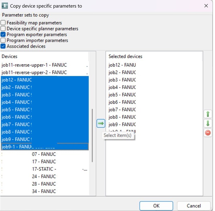 Select the device (her the FANUC robot) which was optimized and which settings shall be used by all other FANUC robots.